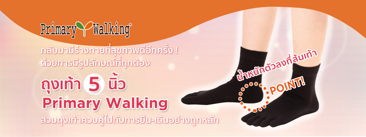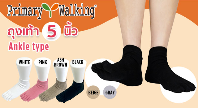 ถุงเท้า 5 นิ้ว Primary Walking® คิดค้นมาเพื่อ เพียงแค่สวมใส่ก็ช่วยยืดนิ้วเท้าที่โก่งงอ ให้คืนสู่รูปร่างเดิม (Primary) และนำไปสู่การยืนอย่างถูกวิธี